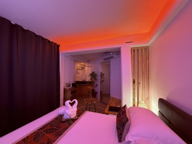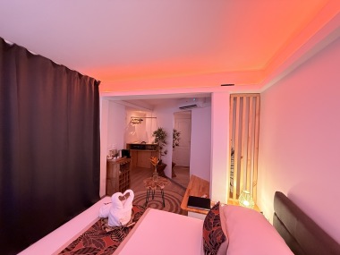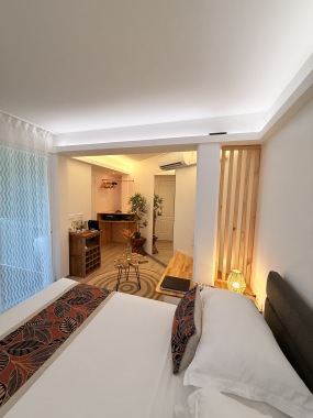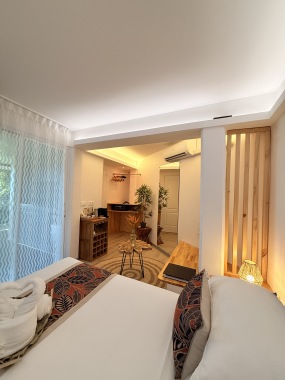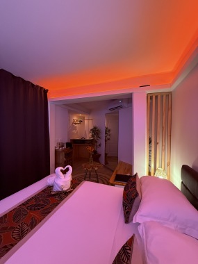 Notre chambre studio offre une expérience intime et confortable, dotée d'une salle de bain privative et de la climatisation pour un séjour agréable. De plus, une petite cuisine est mise à disposition pour ceux qui souhaitent préparer un repas.